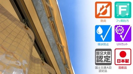 使用されているテント生地は、防炎、吸水防止、UVカットなど、耐候性が高く安心してご使用いただけるものを採用しています。 大型のテント倉庫やトラックのシートなどでも使用されており、強い日差しや風雨にさらされ続ける場所でも抜群の耐久性を発揮する実績と信頼性のある日本メーカーのテント生地です。